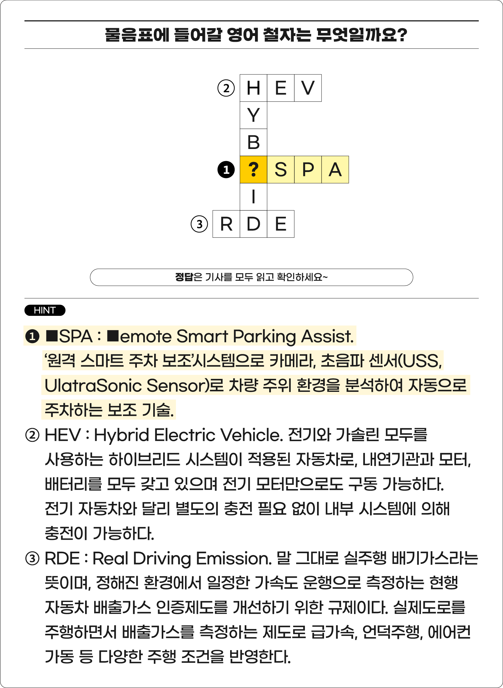 RSPA๋ 'Remote Smart Parking Assist'์ ์ฝ์๋ก ์๊ฒฉ ์ค๋งํธ ์ฃผ์ฐจ ๋ณด์กฐ๋ฅผ ๋ปํฉ๋๋ค. ์ด์ ์๊ฐ ์ฐจ๋ ๋ฐ์์ ์ค๋งํธํค๋ฅผ ์ฌ์ฉํด ์๋์ํค๋ฉด, ์ฐจ๋์ด ์๋์ผ๋ก ์ฃผ์ฐจํ๋ ์์คํ ์ ๋๋ค. ๊ธฐ์กด RSPA๋ ์ฐจ๋ ์ค์ค๋ก ํํ, ์ง๊ฐ ์ฃผ์ฐจ๋ง ๊ฐ๋ฅํ๋๋ฐ์. ๋ณด๋ค ์ฌ์ธํด์ง RSPA2์๋ ์ฌ์ ์ฃผ์ฐจ ๊ธฐ๋ฅ๊น์ง ์ถ๊ฐ๋์ด ์ข์ ๊ณต๊ฐ์์์ ์ฃผ์ฐจ ์คํธ๋ ์ค๋ฅผ ํ ๋์ด์ค๋๋ค. ๊ฒ๋ค๊ฐ ์นด๋ฉ๋ผ๋ฅผ ํตํด ์ฐจ๋ ์ฃผ๋ณ 360๋๋ฅผ ๋ณด์ฌ์ฃผ๋ SVM(์๋ผ์ด๋ ๋ทฐ ๋ชจ๋ํฐ๋ง) ์ต์ ๊น์ง ์๋ ๊ฒฝ์ฐ, ์ฌ๊ฐ์ง๋๋ฅผ ์์ ํ ์์ ์ฃผ๊ธฐ ๋๋ฌธ์ RSPA ๊ธฐ๋ฅ์ด ๋์ฑ ํ์ฑํ๋ฉ๋๋ค.