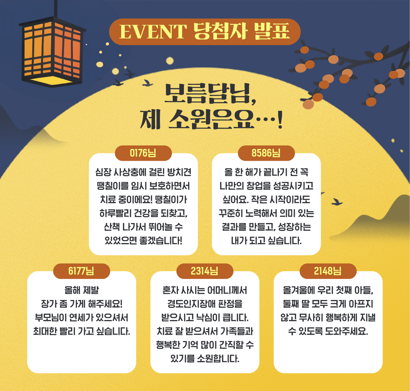 모락모락에 뜬 커다란 보름달! 소원을 빌어주신 모든 모랑이 여러분, 진심으로 감사드립니다.🙏 빌어주신 소원 하나하나에 따뜻한 마음이 가득 담겨 있었는데요. 그중에서 마음을 가장 포근하게 물들인 다섯 분이 행운의 주인공으로 선정되었습니다. 당첨되신 분들께는 가을의 향기를 오래 간직할 수 있는 양키캔들 디퓨저를 보내드릴게요. 참여해 주신 모든 모랑이 여러분께 다시 한번 감사드리며, 빌어주신 소원들이 모두 이뤄지길 모락모락이 진심으로 응원하겠습니다. 다음 달 이벤트에서 또 만나요!💛