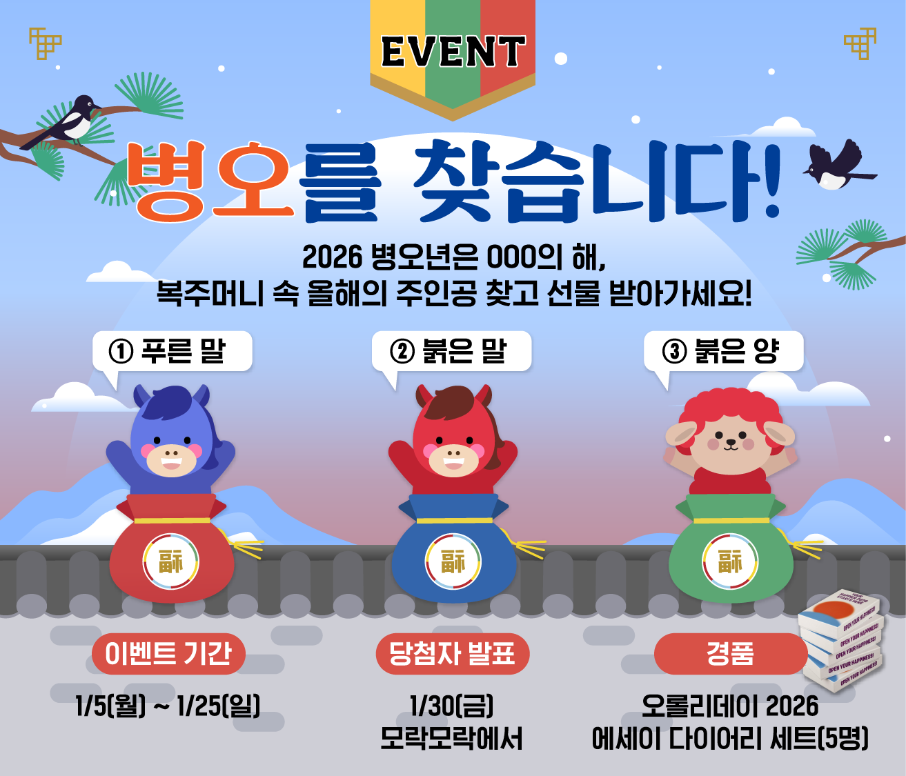 2026๋ ์ ์์งํ๋ ๋ณต์ฃผ๋จธ๋ ์ ์ฌํด์ ์ฃผ์ธ๊ณต! '๋ณ์ค'๋ ์ด๋์ ์จ์ด์์๊น์? ๋ง์ง๋ง ํํธ! ์ง์ฃผ, ๋์ฝ, ํ์ฐ, ๋ณํ์ ์ด๋ฏธ์ง๊ฐ ์๋ ์ด ๋๋ฌผ์ ๋์์์์์๋ '์ ํ ๋ง'๋ผ๊ณ ๋ ๋ถ๋ ค์!๐ด ์ ๋ต์ ๋งํ์ฃผ์ ๋ถ๋ค ์ค ๋ค์ฏ ๋ถ์๊ฒ๋ ์ํด์ ๊ณํ๊ณผ ๋ค์ง, ์ผ์ ์ ๋๋ง์ ์์ธ์ด๋ฅผ ์ ์ ์ ์๋ ๋ค์ด์ด๋ฆฌ ์ธํธ๐๋ฅผ ์ ๋ฌผ๋ก ๋๋ฆด๊ฒ์. ์ด๋ฒ ์ฃผ ์ผ์์ผ๊น์ง! 2026๋ ์ฒซ ํ์ด์ ์ฃผ์ธ๊ณต์ด ๋์ด๋ณด์ธ์!