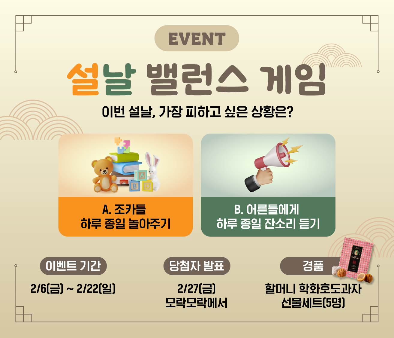 ๋ณ์ค๋ ์ค๋ ์ ๊ธฐ๋ ํด ์ค๋นํ ๋ชจ๋ฝ๋ชจ๋ฝ 2์์ ์ด๋ฒคํธ! ๋ค๊ฐ์ฌ ์ค๋ , ๋ชจ๋์ด ์ฌ๋ฌ๋ถ์ด ๊ฐ์ฅ ํผํ๊ณ ์ถ์ ์๊ฐ์ ์ธ์ ์ธ๊ฐ์? ์กฐ์นด๋ค๊ณผ ํ๋ฃจ ์ข ์ผ ๋์์ฃผ๊ธฐ?๐งธ ์๋๋ฉด ์น์ฒ ์ด๋ฅธ๋ค์๊ฒ ํ๋ฃจ ์ข ์ผ ์์๋ฆฌ ๋ฃ๊ธฐ?๐ข ๋ฐธ๋ฐ์ค ๊ฒ์์ ์ฐธ์ฌํด ์ฃผ์ ๋ถ๋ค ์ค ๋ค์ฏ ๋ถ์๊ฒ๋ ๊ฒจ์ธ์ ๊ฑด๊ฐํ๊ณ ๋ฌ์ฝคํ๊ฒ ๋ง๋ฌด๋ฆฌํ ์ ์๋ ํธ๋๊ณผ์ ์ธํธ๋ฅผ ์ ๋ฌผ๋ก ๋๋ฆด๊ฒ์. ๋ชจ๋ฝ๋ชจ๋ฝ๊ณผ ํจ๊ป ๋ช ์ ์คํธ๋ ์ค, ์ฆ๊ฒ๊ฒ ๋ ๋ ค๋ณด์ธ์.โบ๏ธ