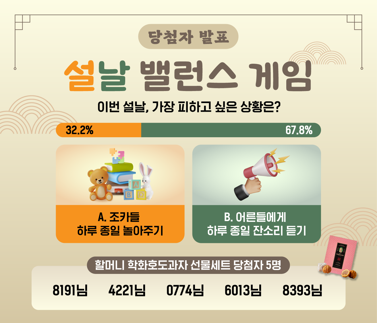 ๋ชจ๋์ด ์ฌ๋ฌ๋ถ! ์ค๋ ๋ฐธ๋ฐ์ค ๊ฒ์ ์ด๋ฒคํธ์ ์ฐธ์ฌํด ์ฃผ์ ์ ์ ๋ง ๊ฐ์ฌํฉ๋๋ค. โ์กฐ์นด๋ค๊ณผ ํ๋ฃจ ์ข ์ผ ๋์์ฃผ๊ธฐ๐งธ vs ์น์ฒ ์ด๋ฅธ๋ค์๊ฒ ํ๋ฃจ ์ข ์ผ ์์๋ฆฌ ๋ฃ๊ธฐ๐ขโ ์ค, ๋ชจ๋์ด ์ฌ๋ฌ๋ถ์ด ๋ ํผํ๊ณ ์ถ์๋ ์ํฉ์ ๋ฐ๋ก <์น์ฒ ์ด๋ฅธ๋ค์๊ฒ ํ๋ฃจ ์ข ์ผ ์์๋ฆฌ ๋ฃ๊ธฐ>์์ต๋๋ค!๐ ๋ฐธ๋ฐ์ค ๊ฒ์์ ์ฐธ์ฌํด ์ฃผ์ ๋ถ๋ค ์ค ๋ค์ฏ ๋ถ์๊ฒ๋ ๊ฒจ์ธ์ ๋ฌ์ฝคํ๊ฒ ๋ง๋ฌด๋ฆฌํ ์ ์๋ ํธ๋๊ณผ์ ์ธํธ๋ฅผ ์ ๋ฌผ๋ก ๋ณด๋ด๋๋ฆด๊ฒ์. ์ด๋ฒ ์ด๋ฒคํธ๊ฐ ๋ช ์ ๋์ ์์ธ ์คํธ๋ ์ค๋ฅผ ๋ ๋ฆฌ๋ ๋ฐ ์กฐ๊ธ์ด๋๋ง ๋์์ด ๋์๊ธธ ๋ฐ๋๋๋ค. ๋ค๊ฐ์ฌ 3์ ์ด๋ฒคํธ๋ ๋ง์ ๊ธฐ๋ ๋ถํ๋๋ ค์!๐