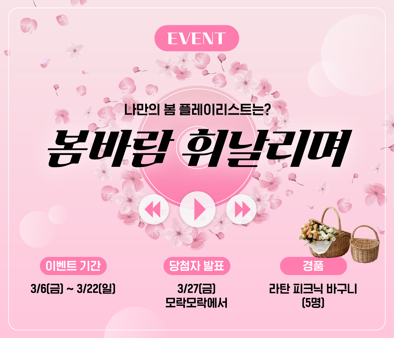 ๋ชจ๋ฝ๋ชจ๋ฝ์ ๋ด๋ง์ด ์ด๋ฒคํธ!๐ท ๋ชจ๋์ด ์ฌ๋ฌ๋ถ์ ๋ด์ด ์ค๋ฉด ์ ๋ ๋ ์์ฃผ ๋ฃ๊ฒ ๋๋ ๋ ธ๋๊ฐ ์์ผ์ ๊ฐ์? ์ถ๊ทผ๊ธธ ๋ฐ๊ฑธ์์ ๊ฐ๋ณ๊ฒ ํด์ฃผ๋ ์ํผํ ๊ณก, ์ฐฝ๋ฌธ์ ์ด์ด๋๊ณ ๋ฃ๊ธฐ ์ข์ ํธ์ํ ๋ ธ๋, ๋ด๋ฐ๋์ฒ๋ผ ๊ธฐ๋ถ ์ ํ์ด ๋๋ ํ ๊ณก๊น์ง ์ด๋ค ๋ ธ๋๋ ํ์์ ๋๋ค. ๋ ธ๋์ ํจ๊ป ๋ ์ค๋ฅด๋ ์งง์ ์ํผ์๋๋ ์ถ์ฒ ์ด์ ๋ ๊ณ๋ค์ฌ ์ฃผ์๋ฉด ๋น์ฒจ ํ๋ฅ UP! ์ฐธ์ฌํด ์ฃผ์ ๋ถ๋ค ์ค ๋ค์ฏ ๋ถ๊ป๋ ๋ด ์ํ์ ํ์ํ, ๋ผํ ํผํฌ๋ ๋ฐ๊ตฌ๋๋ฅผ ์ ๋ฌผ๋ก ๋๋ฆด๊ฒ์. ์งง์์ ๋ ์์ฌ์ด ๋ด, ๋ชจ๋์ด ์ฌ๋ฌ๋ถ์ ํ๋ ์ด๋ฆฌ์คํธ๋ก ์ด ๊ณ์ ์ ์ค๋์ค๋ ์ถ์ตํด ๋ณด์ธ์!๐ต